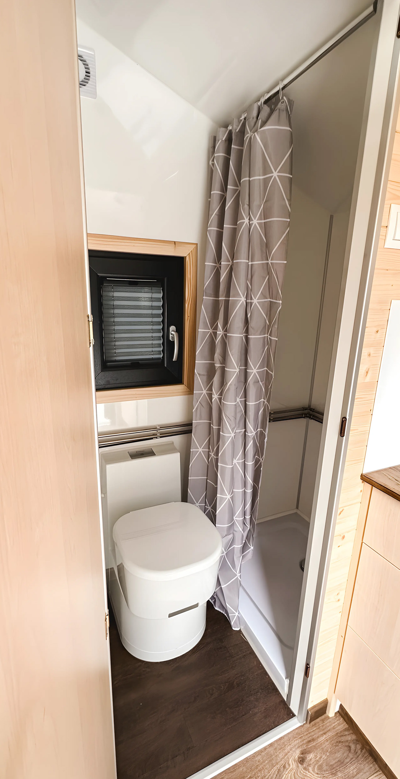 La cuisine de la Honey 216 est spécialement conçue pour maximiser la fonctionnalité, même dans un espace restreint. Elle est équipée d’une cuisinière à deux foyers à gaz propane, semblable à celles que l’on trouve dans les vans de camping, ainsi que d’un évier, d’un petit réfrigérateur et de quelques éléments de rangement. La salle de bain est la seule pièce séparée de cette tiny house, accessible par une porte. À l’intérieur, on retrouve des commodités essentielles : un toilette chimique style van de camping, une douche et un évier, le tout dans un cadre minimaliste.