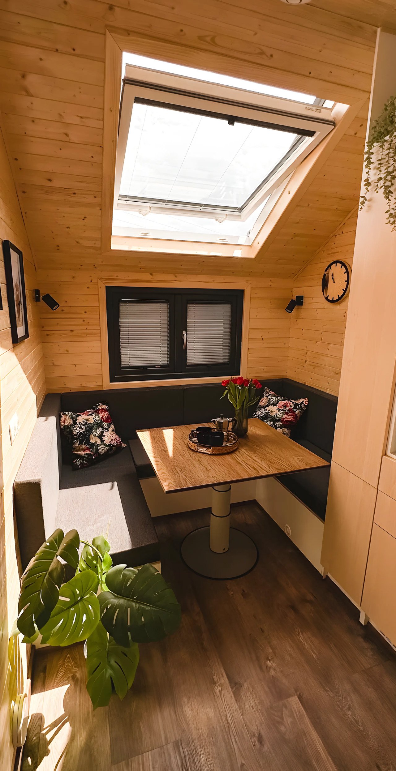 L’entrée se fait par une porte en verre qui mène à une zone de vie lumineuse. L’aménagement comprend un coin salon et une salle à manger en forme de U, avec une table conviviale, agrémentée d’un puits de lumière qui permet à la lumière naturelle d’inonder l’intérieur. Ne disposant pas d’une chambre à coucher traditionnelle, le canapé de cet espace sert également de lit, illustrant la flexibilité de cet agencement.